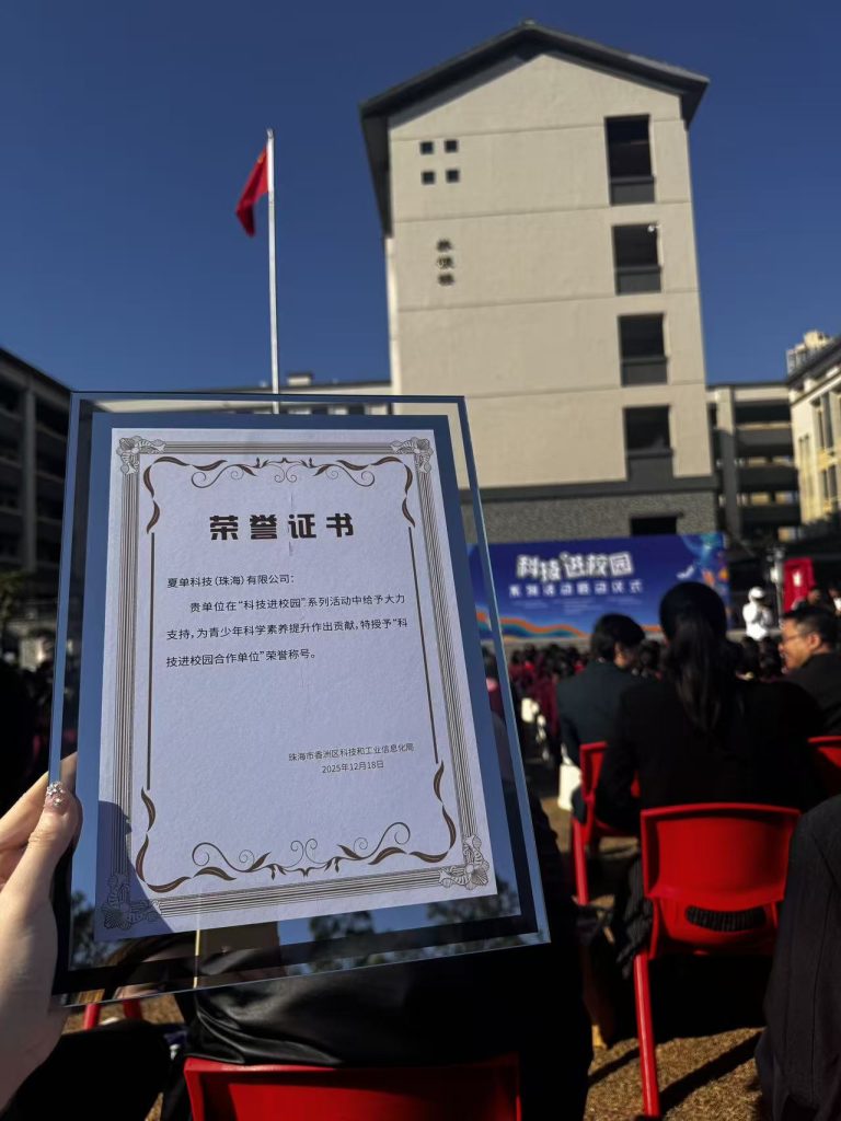 夏单科技作为15家支持单位之一参与活动,并获由珠海市香洲区政府颁发的“科技进校园合作单位”荣誉证书。